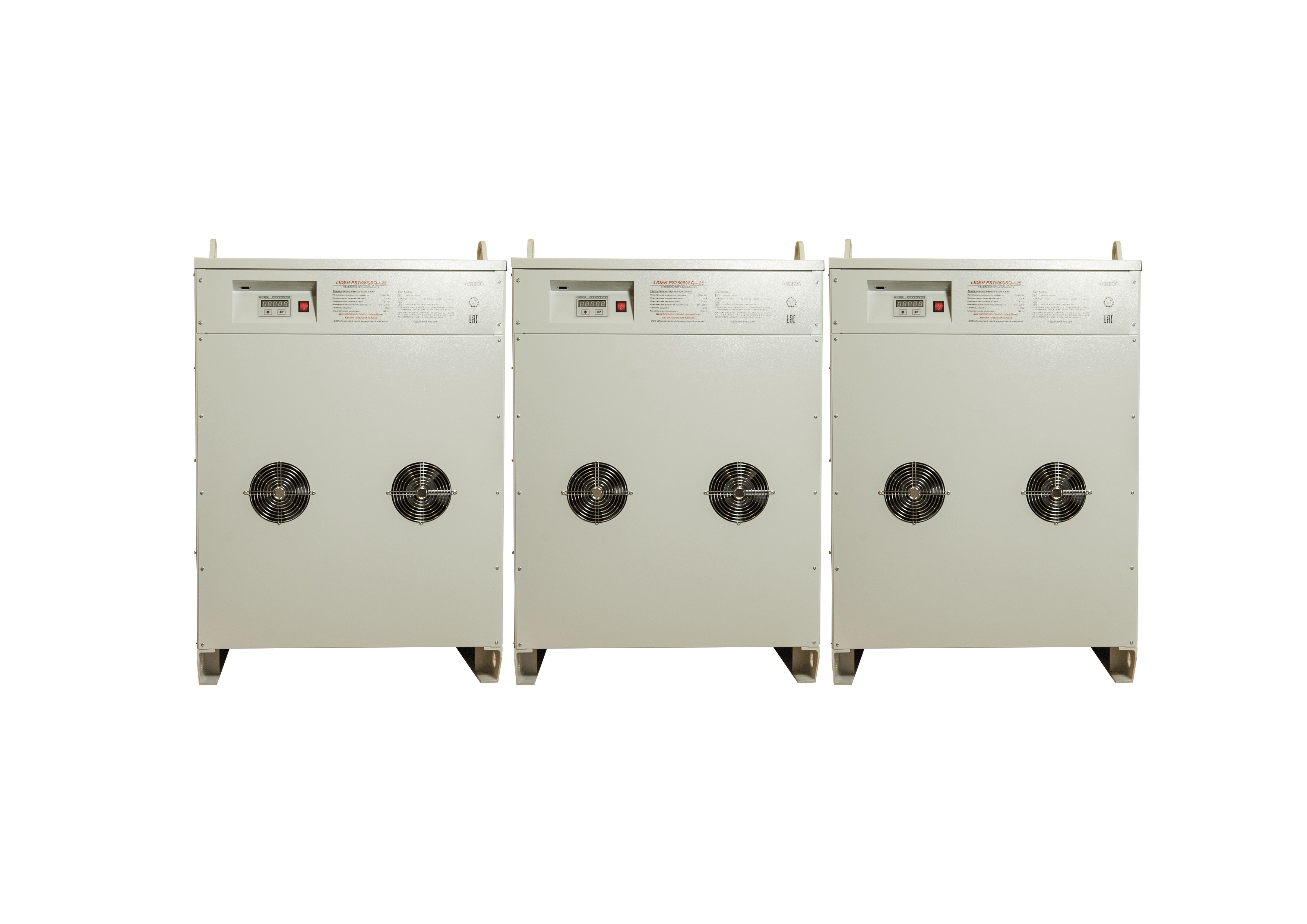 Трехфазные комплекты собираются из трех однофазных стабилизаторов, организующих трехфазную сеть по схеме «звезда». При этом комплекты мощностью от 15 кВА до 45 кВА могут быть смонтированы на удобной и функциональной вертикальной стойке (приобретается отдельно). По желанию заказчика стойки могут комплектоваться ручным байпасом и контролем трехфазного выхода, либо обеими функциями одновременно.